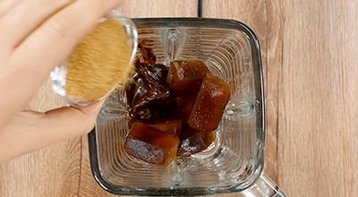 Agrega a la licuadora los cubos de café congelado, y tres cucharadas de salsa de chocolate, más dos cucharadas de azúcar