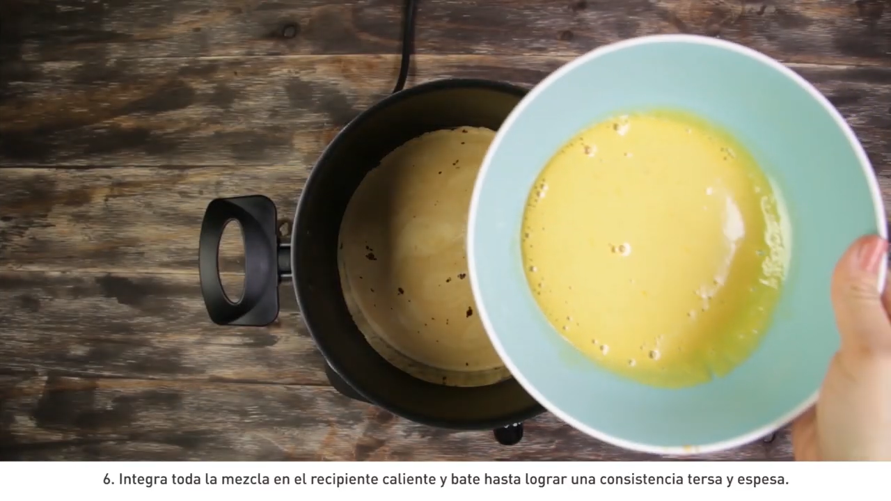 Integra toda la mezcla en el recipiente caliente y bate hasta lograr una consistencia tersa y espesa.