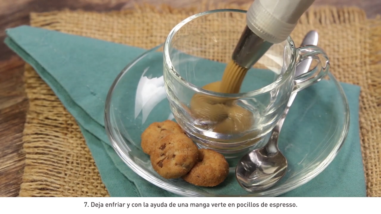 Deja enfriar y con la ayuda de una manga verte en pocillos de espresso.