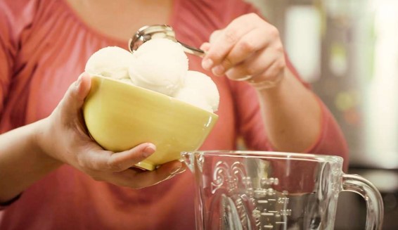 2. Luego añadir 8 bolas de helado de vainilla a la licuadora