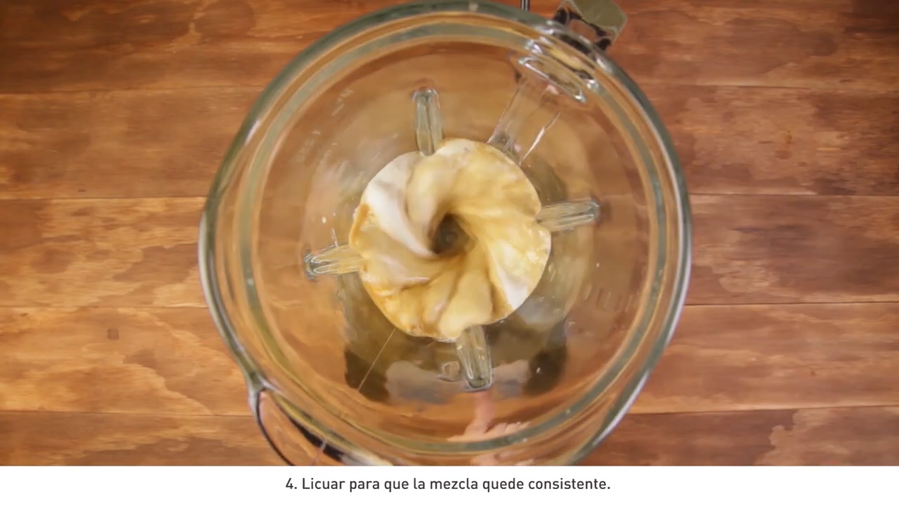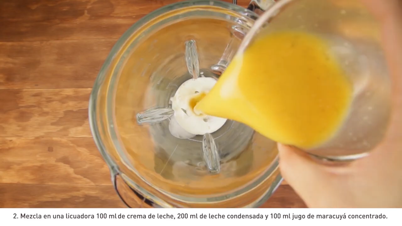 Mezcla en una licuadora 100 ml de crema de leche, 200 ml de leche condensada y 100 ml de jugo de maracuyá concentrado