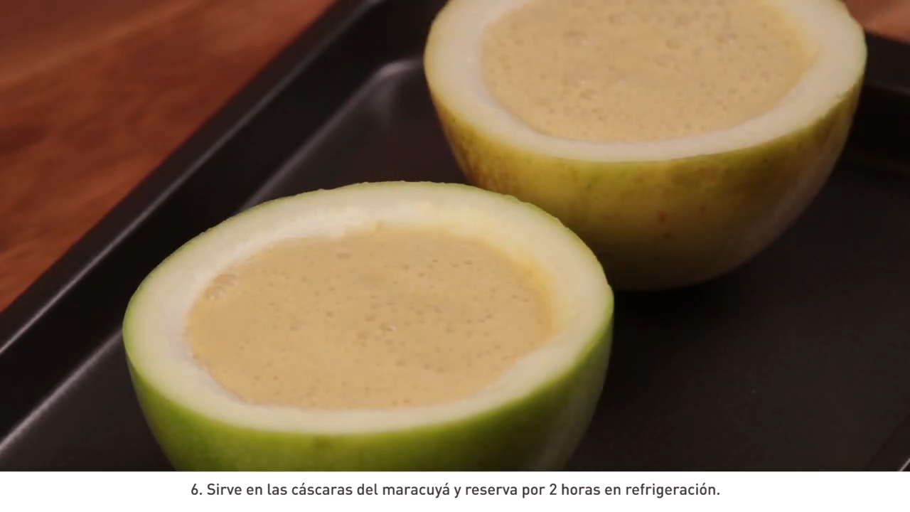 Sirve en las cáscaras de maracuyá y reserva por 2 horas en refrigeración.