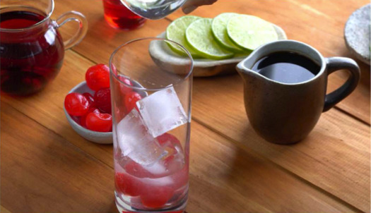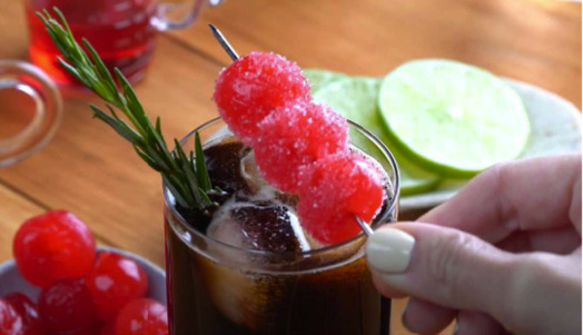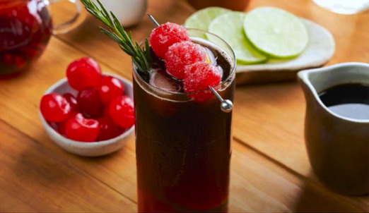 Decorar con 1 rodaja de limón, q rama de romero y 3 cerezas con azúcar.