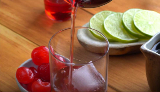 En un vaso largo, añadir 4 cerezas, 3 cubos de hielo y 80 ml de soda.