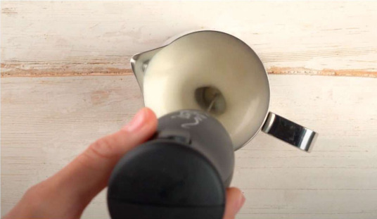 Con la ayuda de una cuchara, añadir una capa de leche previamente espumada.