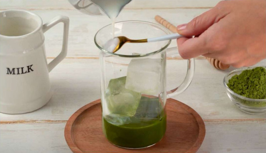 Agregar hielo en un vaso largo y servir la mezcla de té matcha.
