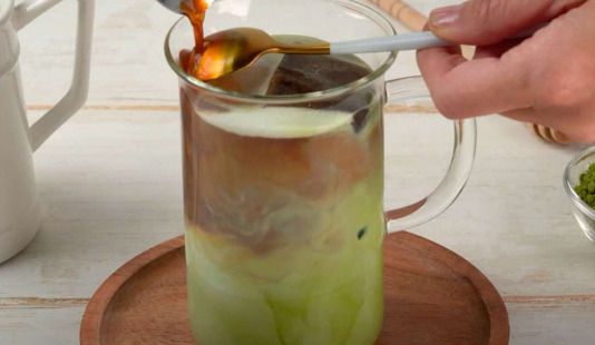Con la misma técnica, agregar el café a la mezcla y disfrutar de un delicioso Café Matcha Frío.