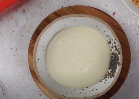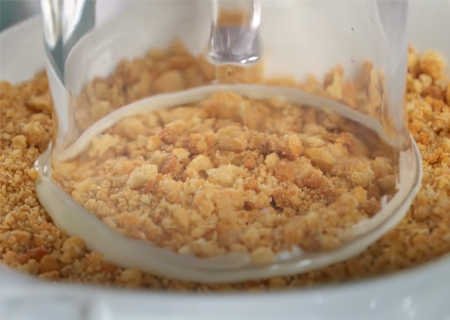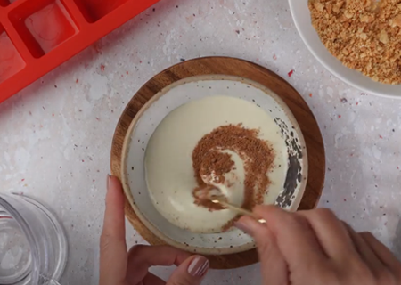 Michelar un vaso con chocolate blanco y galletas Ducales Tentación trituradas.