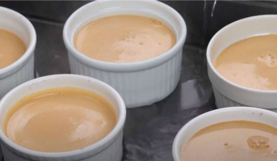 3. Verter la mezcla en recipientes cerámicos y llevarlos al baño maría en una refractaria, horneando por 70 minutos a 140°C