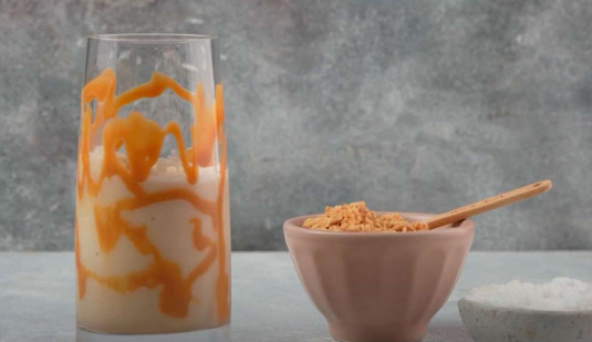 Licuar 5 cubitos de hielo, 120 ml de leche de coco, 2 cucharadas de Colcafé Cappuccino Avellana y 1 cucharadita de azúcar.