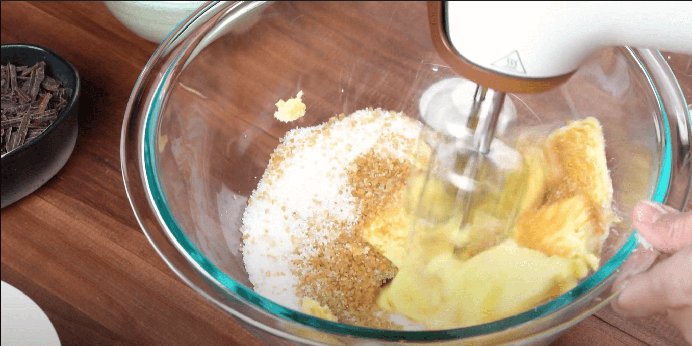 Mezclar 100 gr de mantequilla blanda sin sal, 80 gr de azúcar morena y 50 gr de azúcar granulada.