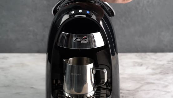 Preparar un café espresso Matiz Ébano en tu Máquina de Cápsulas Express Nutresa, servir sobre un vaso diferente al de la preparación final.
