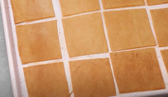 1. Ubicar la masa de hojaldre en un molde de horneo con papel parafinado, poner un molde encima para que la masa no se crezca y hornear a 180°C por 15 minutos.