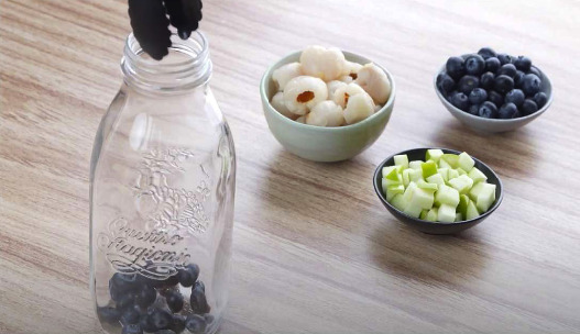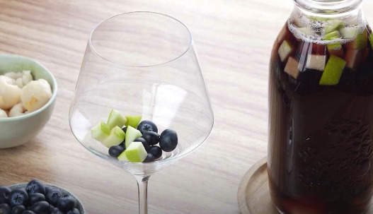 En una jarra de vidrio, agrega arándanos, trozos de manzana y lyches para darle el primer toque frutal a nuestra sangría.