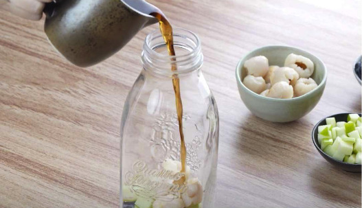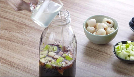 Agrega 300 ml de vino tinto, 50 ml de almíbar de lyches y 150 ml de soda.