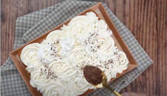 6. Una vez refrigerada, decorar con crema chantillí y chocolate rallado en la superficie