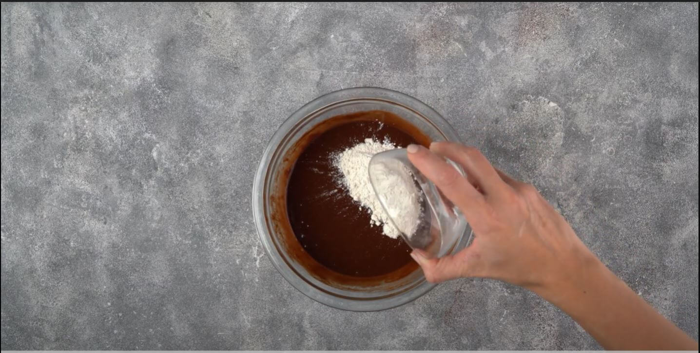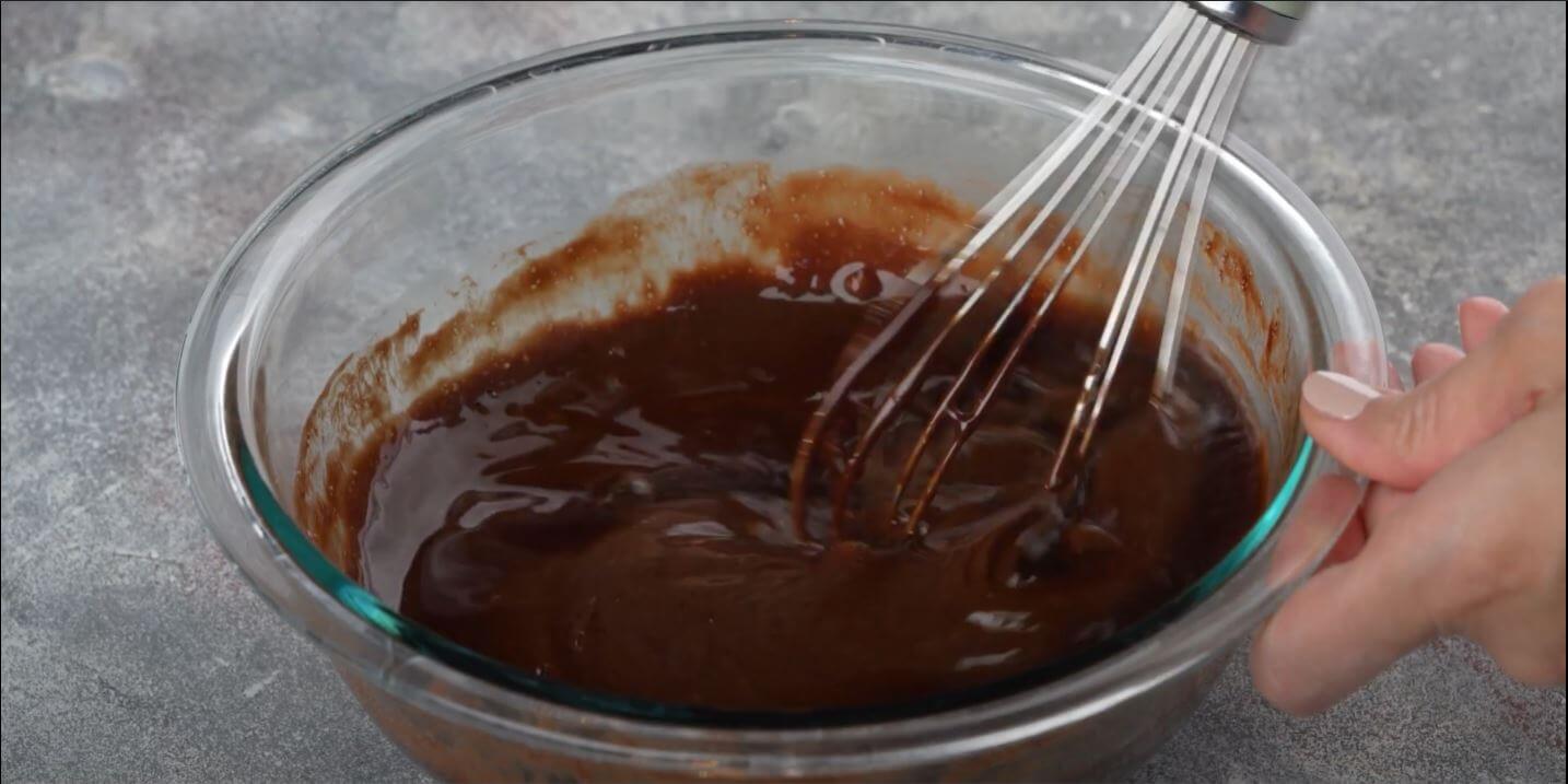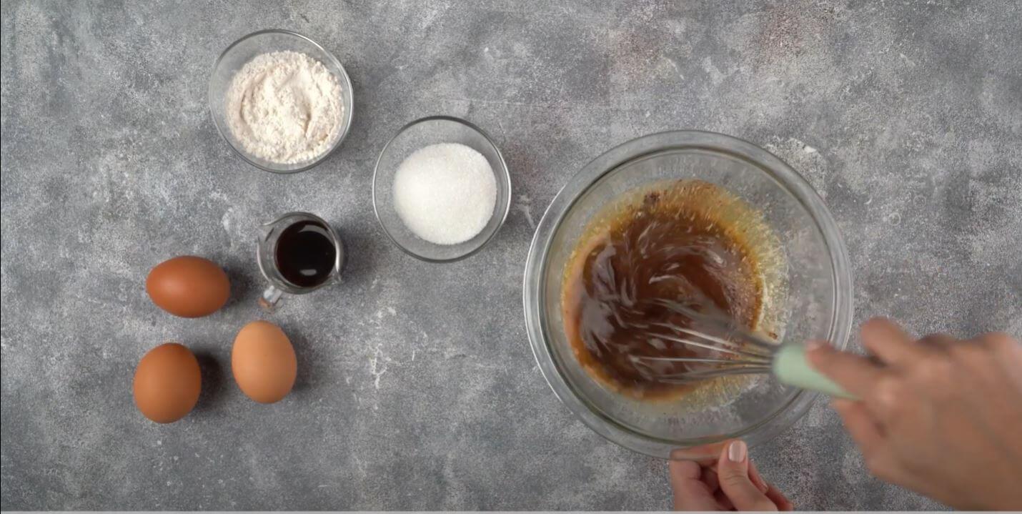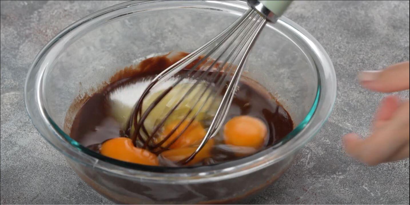 Agregar al chocolate derretido 60 gr de azúcar, 3 huevos y mezclar hasta integrar