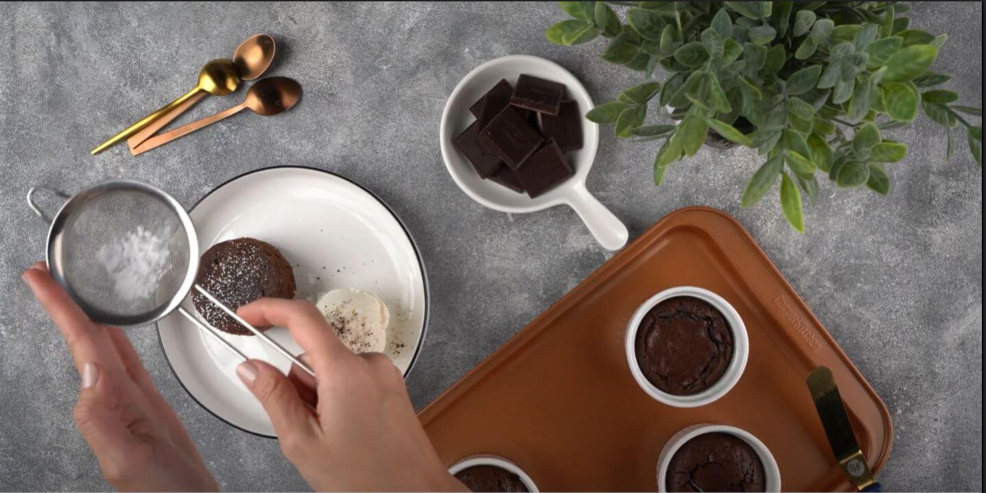 Dejar enfriar por 8 minutos, sacar del molde y acompañar con helado de vainilla. Decorar con Colcafé Granulado y azúcar glass