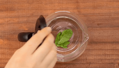 Decora la superficie con masmelos pequeños y hojas de hierbabuena
