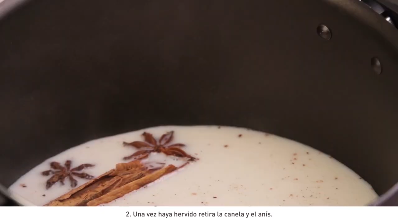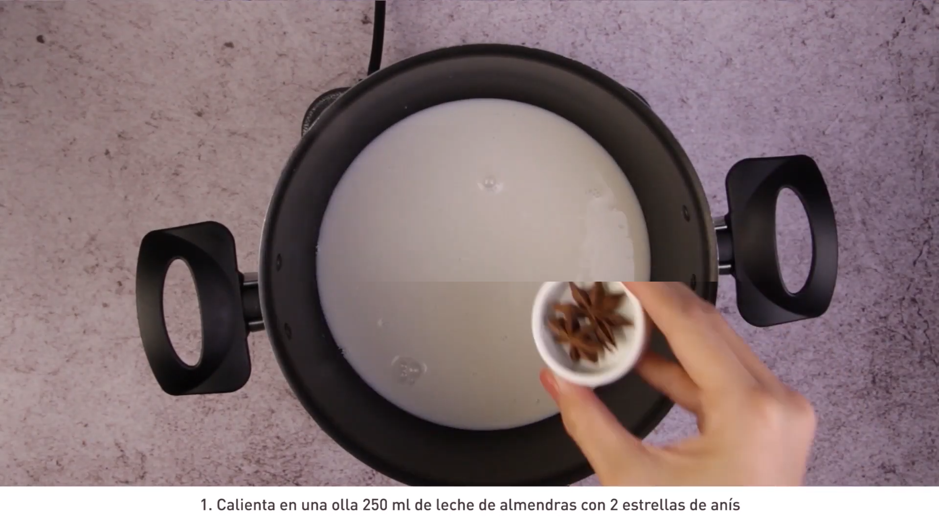 Calienta en una olla 250 ml de leche de almendras con 2 estrellas de anís, canela en rama y nuez moscada rayada.