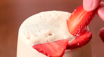 Sirve sobre un vaso alto y decora con fresas cortadas en rodajas. Disfruta de una refrescante bebida en pocos pasos.