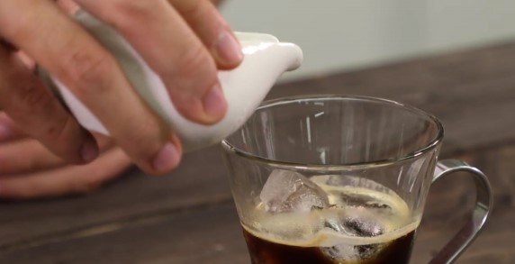2. Verter el espresso en un vaso con 60 gramos de hielo hielo y agregar 120 ml de leche. Revolver.