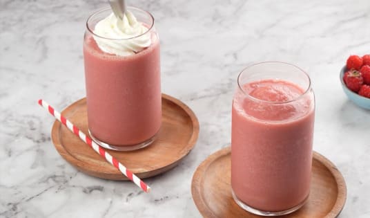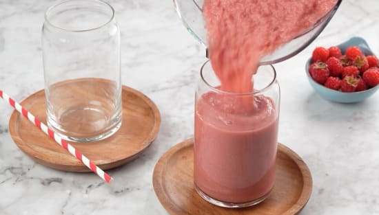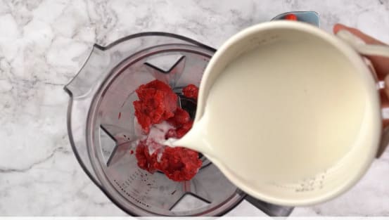 Agregar en una licuadora 1 ¼ taza de frambuesas congeladas, 1 ½ taza de leche de almendras, 1 taza de Colcafé Clásico, 5 cucharas de miel, ¼ de cucharadita de esencia de vainilla y 1 taza de hielo.