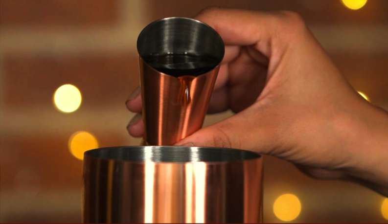 Agitar la coctelera y revolver. Servir sobre un vaso para coctel