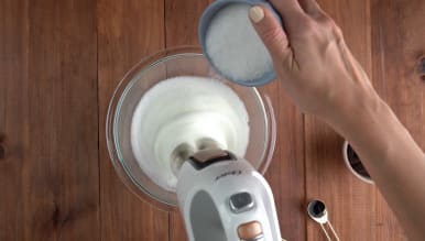 Añadir en forma de lluvia 80 gr de azúcar refinada mientras se continúa batiendo.