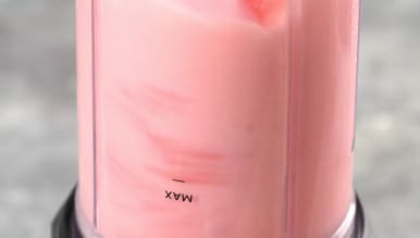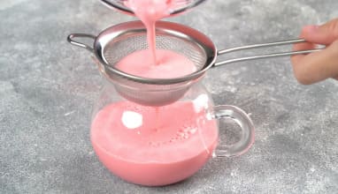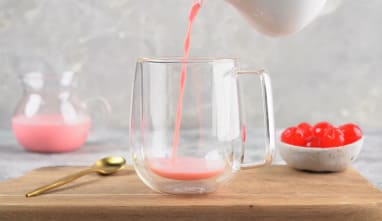 Preparar la leche rosada licuando 4 cerezas, 1 cda de almíbar de cereza y 80 ml de leche caliente.